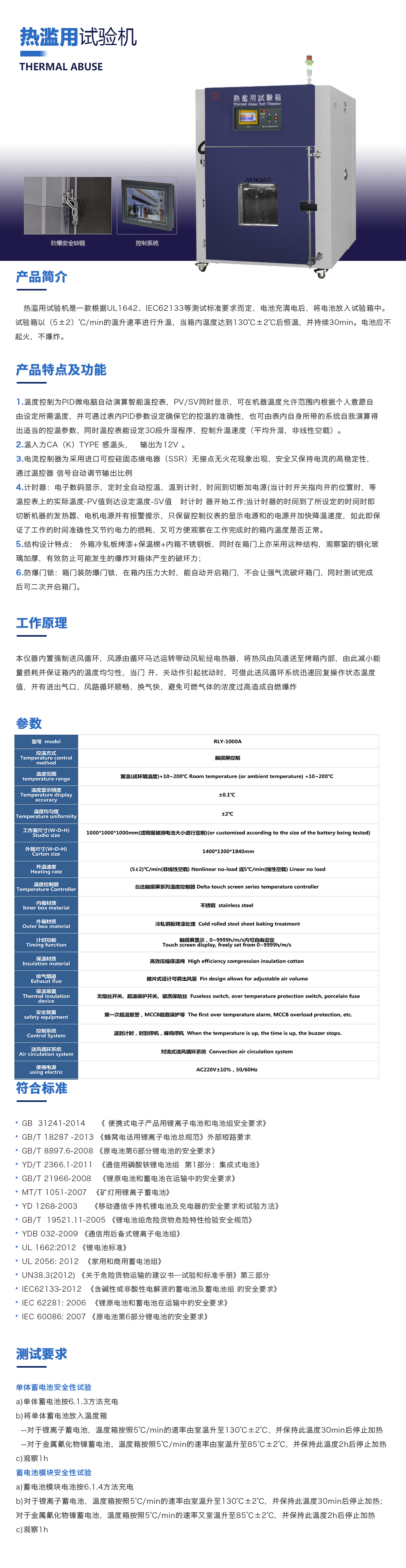 產品型號:JQ-8103 品牌:劍 喬 用途:熱濫用試驗箱是一款根據(jù)UL1642、IEC62133等測試標準要求而定,電池充滿電后,將電池放入試驗箱中。試驗箱以(5±2)℃/min的溫升速率進行升溫,當箱內溫度達到130℃±2℃后恒溫,并持續(xù)咨詢熱線:13829135130